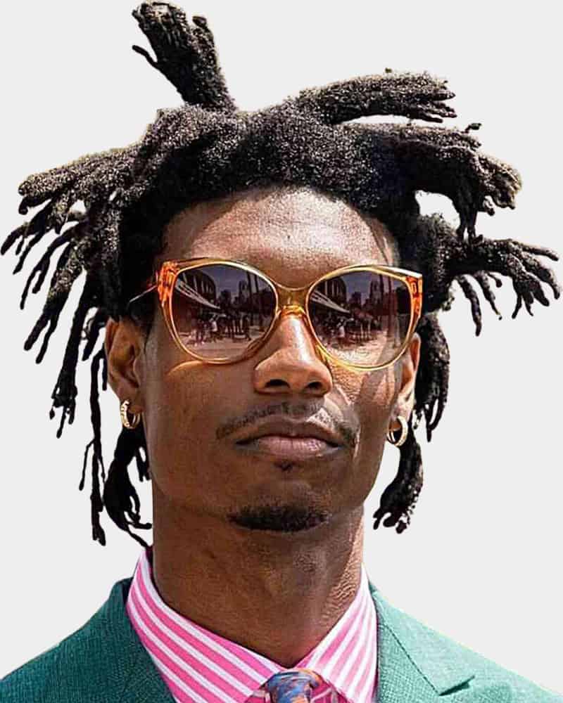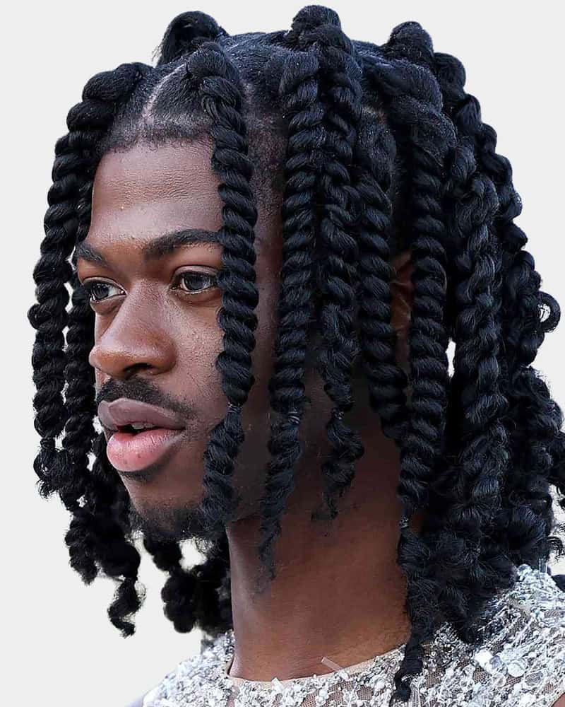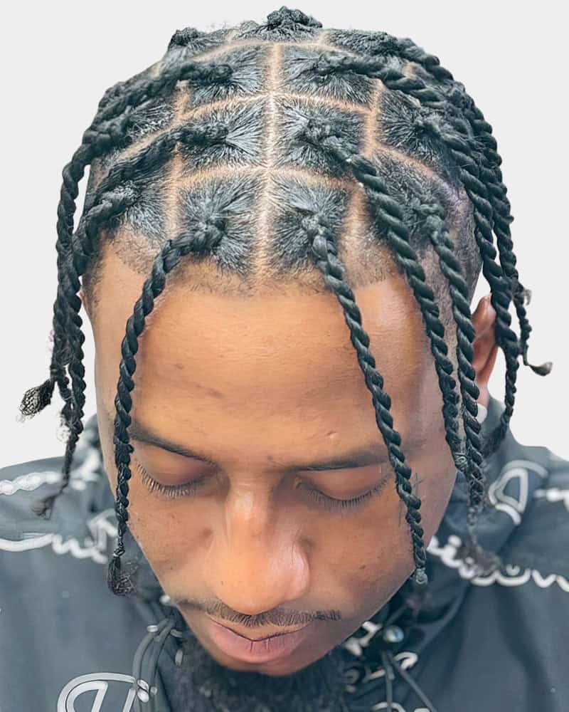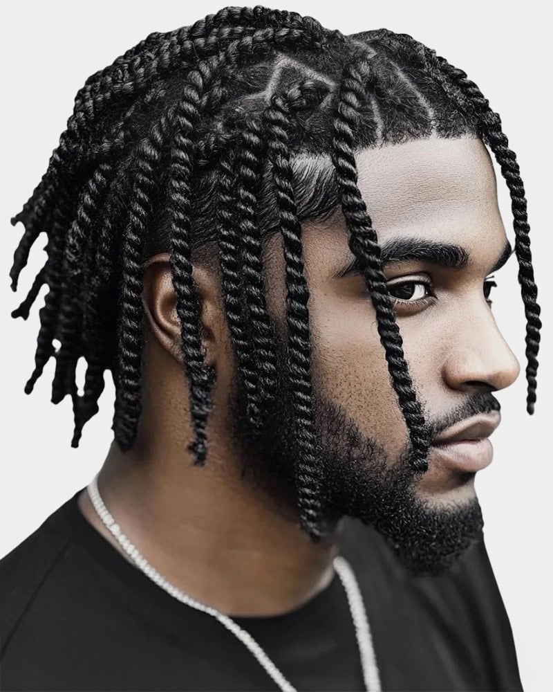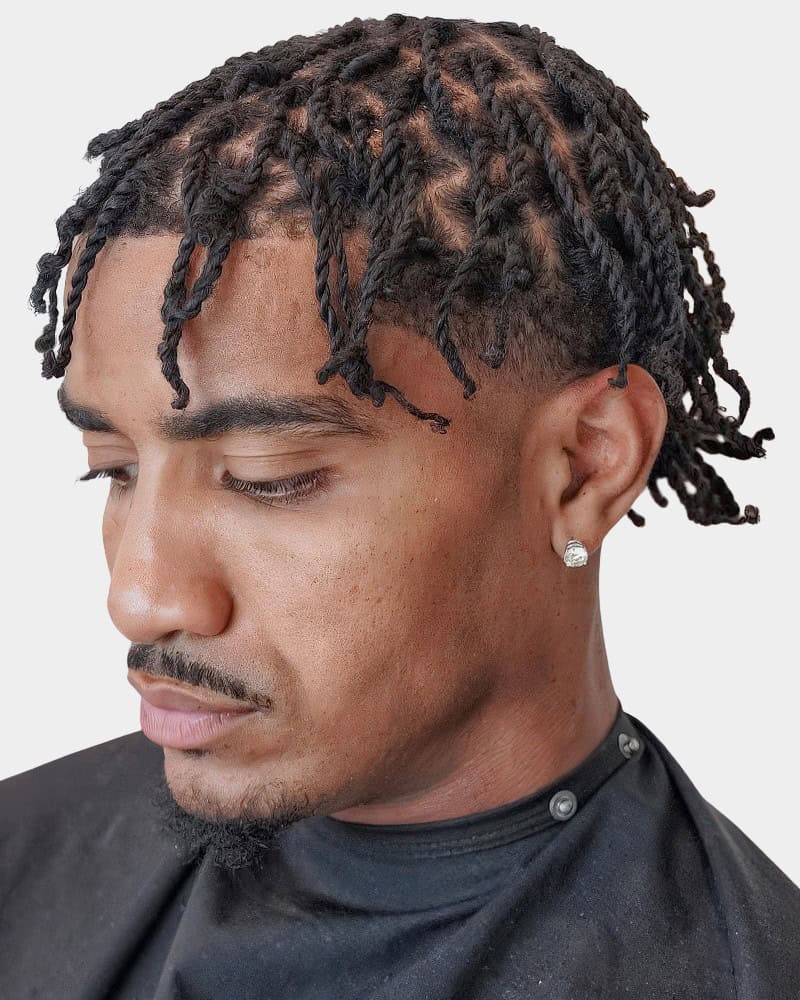 This style combines clean, low-maintenance sides with playful texture up top. Twists are easy to install and style, while the fade keeps everything sharp. We’d recommend opting for a low or temple fade to ensure all the focus remains on the twists themselves.