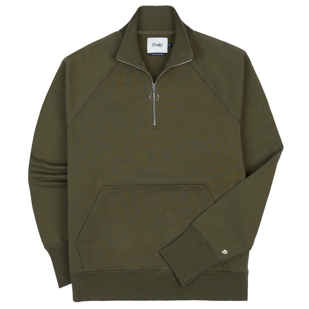 - Drake’s Khaki Green Cotton Quarter Zip Sweatshirt