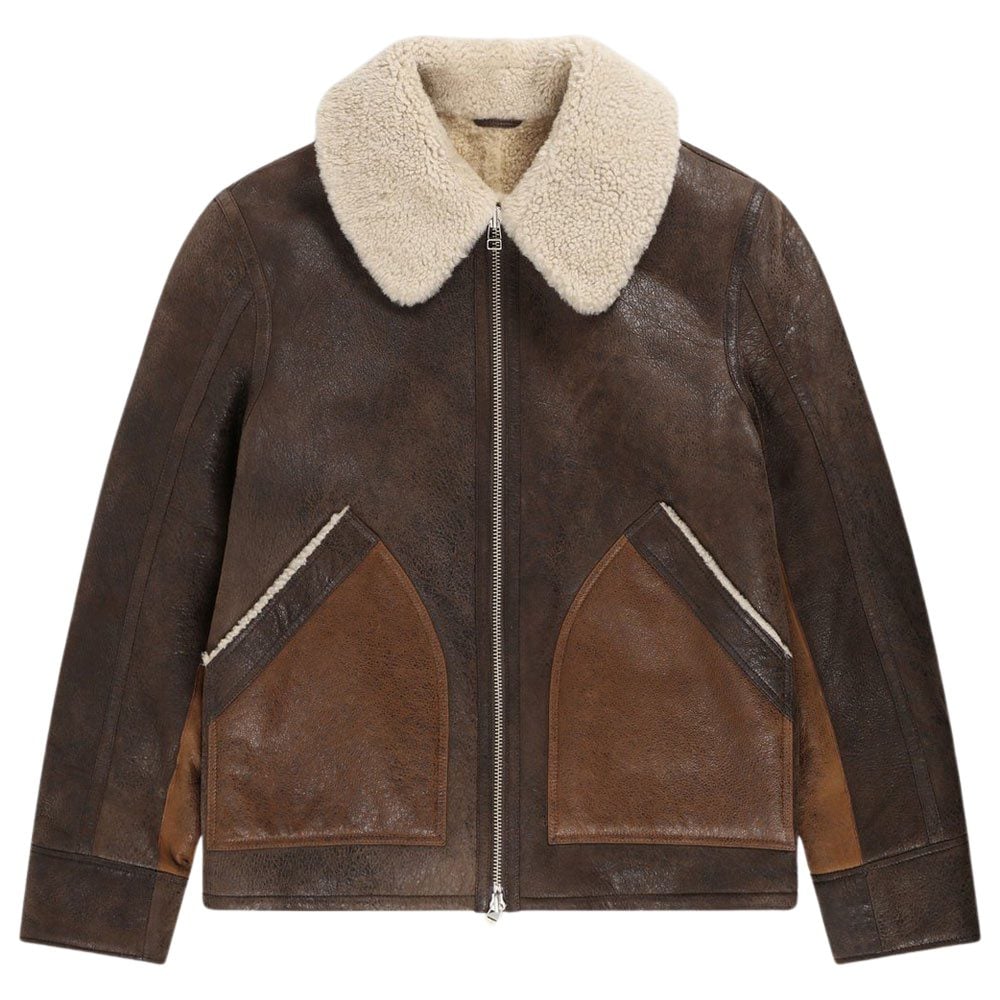 Naturally bulky thanks to that thick, dense pile of curly wool and beautifully tactile owing to the buttery-soft nap of the leather hide, it’s a ‘look at me’ piece if there ever was one. Typically tan with a creamy shearling collar, it’s not gaudy or embellished, but it screams money.