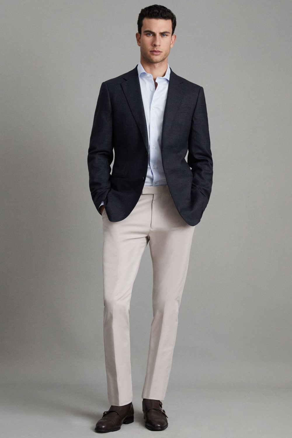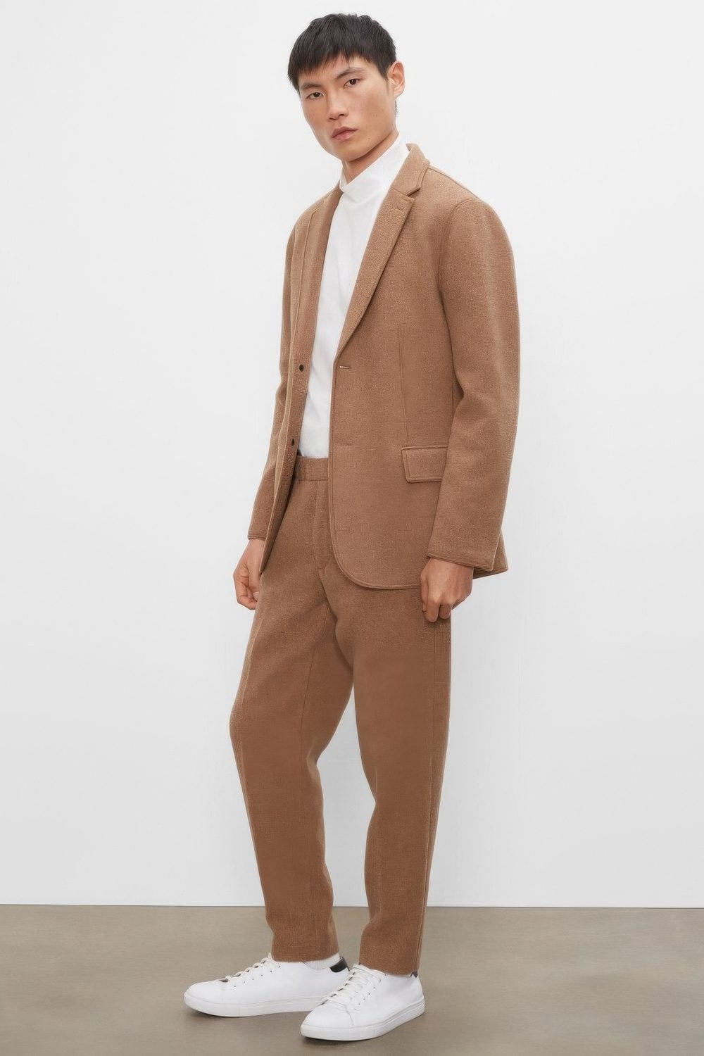 Tone down the dressiness by forgoing a full suit in favour of separates. It’s still smart and shows you’ve made an effort, but different colours, top and bottom, give it a more laid-back look.