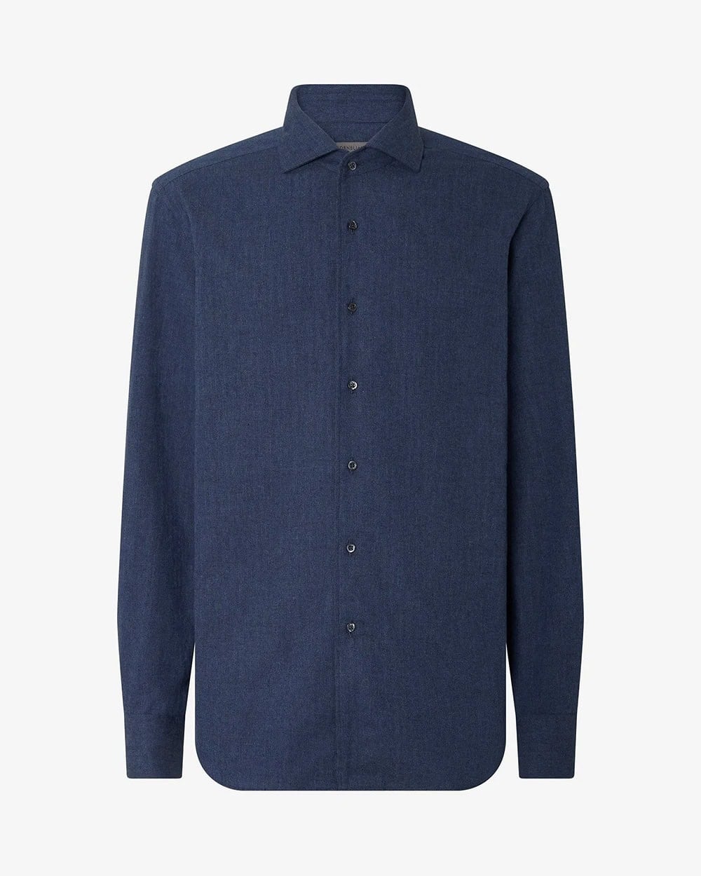 The best versions mix cotton with a touch of cashmere for extra softness, or use finely brushed cotton flannel that feels almost sueded to the touch. Patterns stay subtle: herringbone weaves, understated checks, muted blues and beiges that sit effortlessly under knitwear or tailoring. Corneliani’s FW25 collection uses these textures to great effect, balancing warmth with clean lines and beautifully shaped collars.
