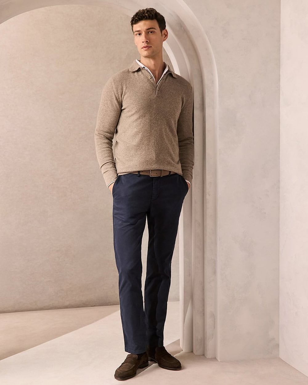 In fact, one of our favourite uses for a knitted polo is as a layering piece to dress down tailoring, which can work well when it comes to softening up suits for smart-casual settings. Go for a neutral block colour to make mixing and matching as simple as possible, or opt for either a light pastel or an earthy autumnal colour to make your outfits pop in a seasonally relevant manner.