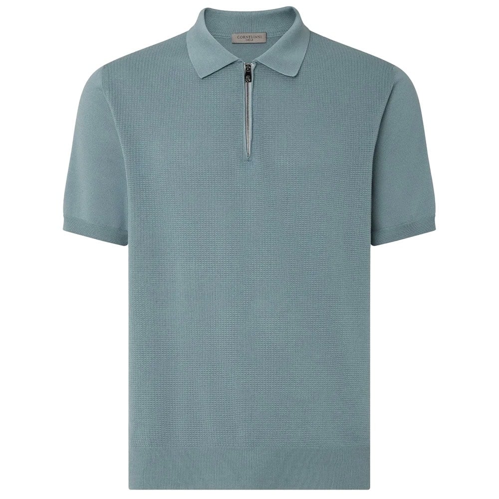 - Corneliani Blue Green Zip-up Pima Cotton Polo Shirt
