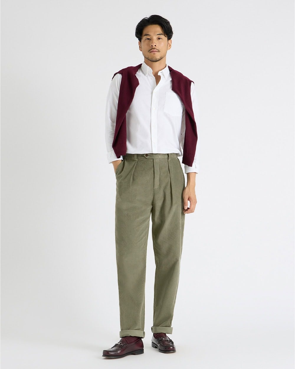 This is prep, but not as you remember it. The crisp white button-down is classic, but the olive cords and deep burgundy knit thrown over the shoulders give the look a cooler, more contemporary edge. It’s collegiate, sure — just minus the student union energy.